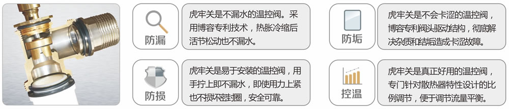虎牢關(guān)溫控閥是博容公司專(zhuān)門(mén)針對(duì)散熱器工作特性而設(shè)計(jì)的創(chuàng)新專(zhuān)利產(chǎn)品,獲得三項(xiàng)國(guó)家專(zhuān)利,除了調(diào)節(jié)方便外,還具有防漏、防垢、防損等特點(diǎn),在2015年北京輻射采暖制冷創(chuàng)新大賽中獲得優(yōu)秀創(chuàng)新獎(jiǎng)。是一種與其他任何溫控閥不同的全新產(chǎn)品。